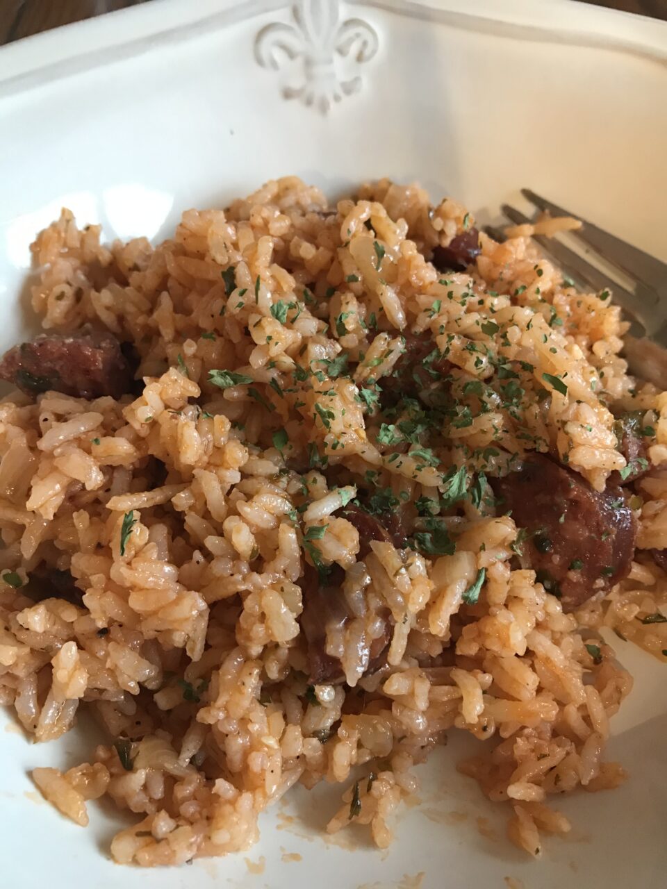 Another common practice is the one pot prep. Jambalaya is made all in one pot, but I cheat a little. Instead of adding the uncooked rice to the pot with all the ingredients, I cook the rice in a rice cooker and add the cooked rice to the sausage that is simmering in the chicken broth and tomato sauce. The rice comes out perfect every time! Although the rice is cooked, it absorbs the sauce perfectly for a wonderful dish.