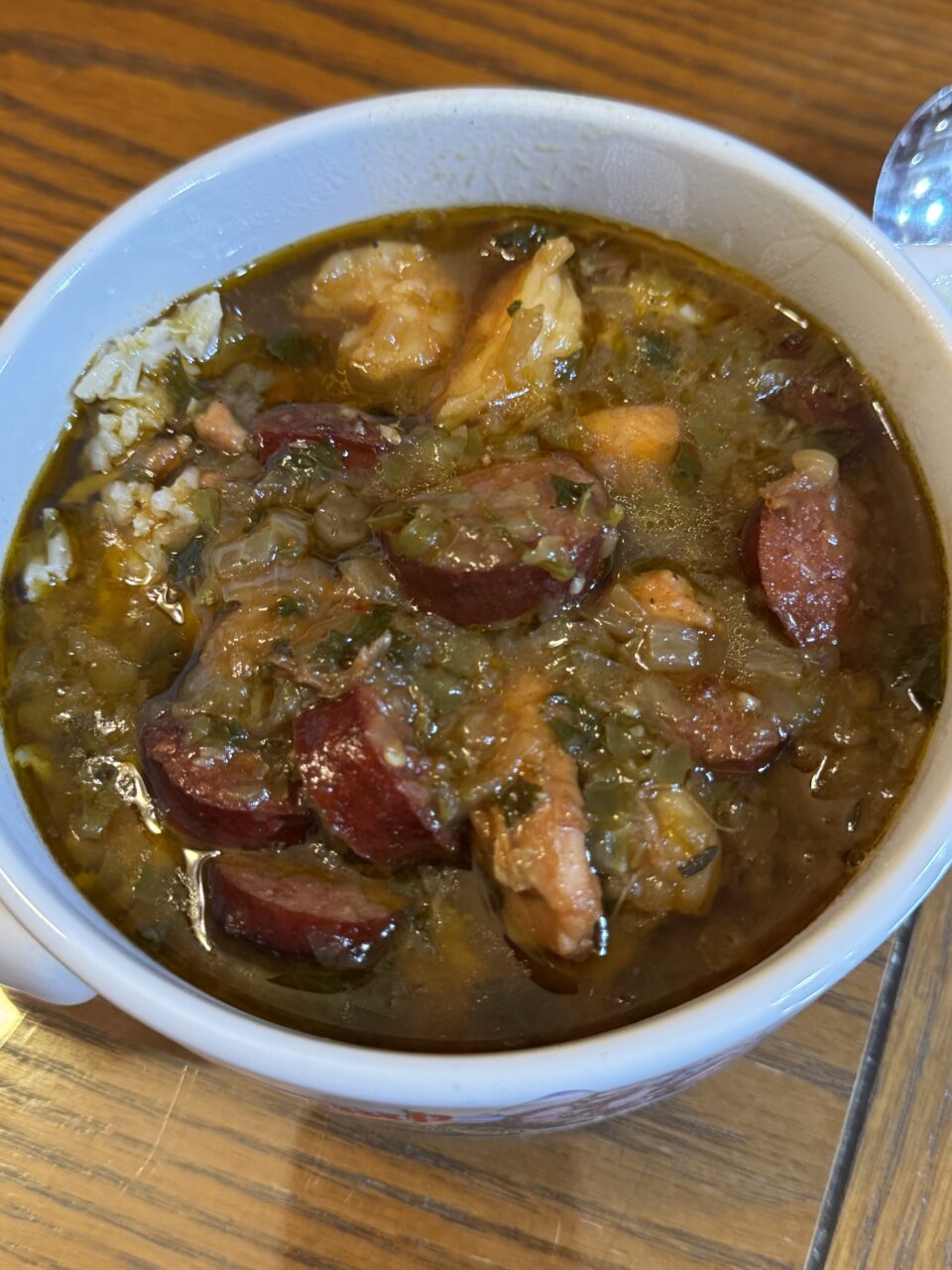 - Spoon hot cooked rice into a bowl and ladle the gumbo over it. Use a slotted spoon the sausage, chicken and shrimp!