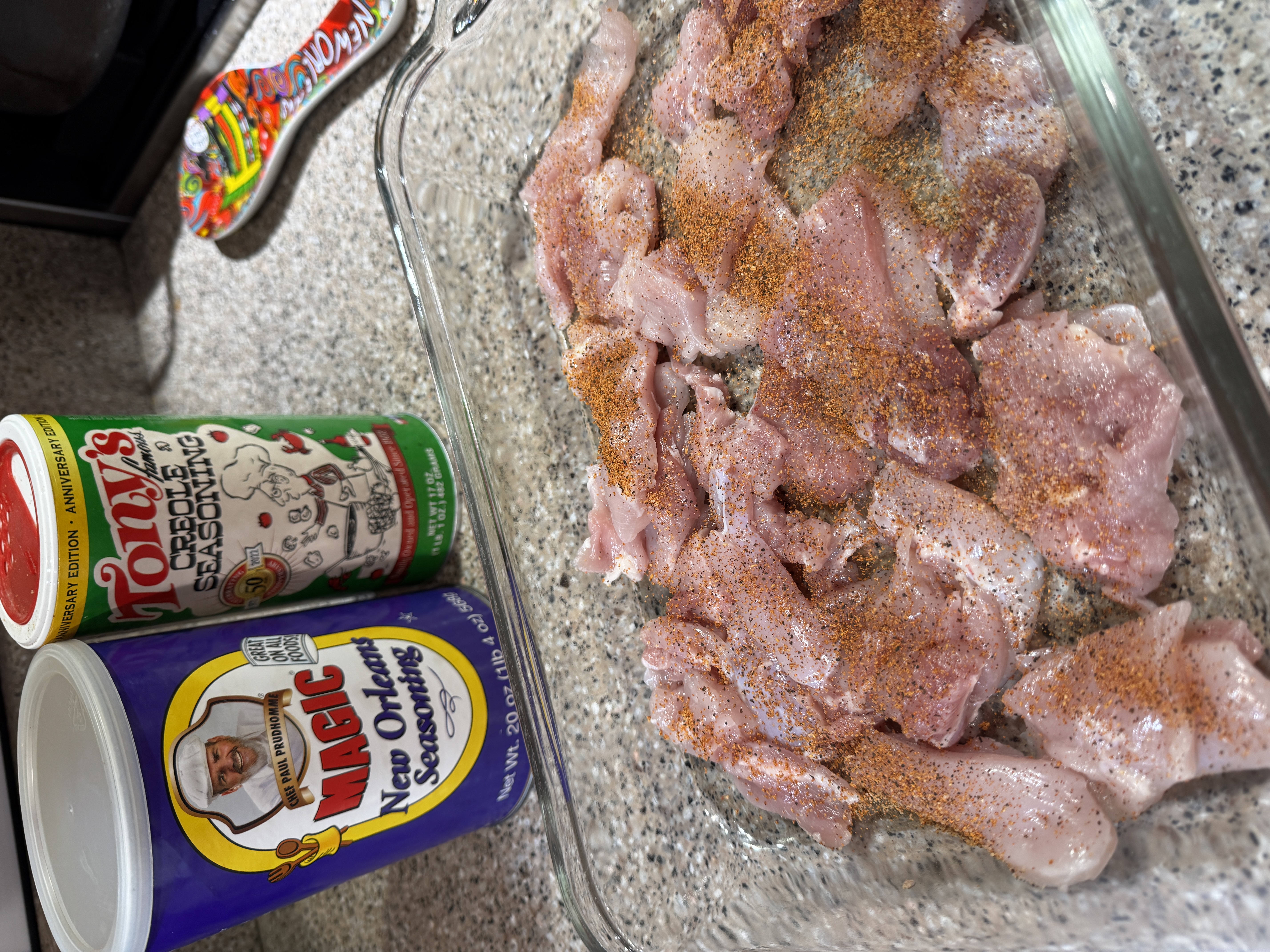 - Remove fat from the chicken thighs and cut them into 1-inch pieces. Sprinkle 1 tbs Paul Prudhomme's Meat or Poultry Magic® and 1tbs Tony Chachere's Creole Seasoning®.