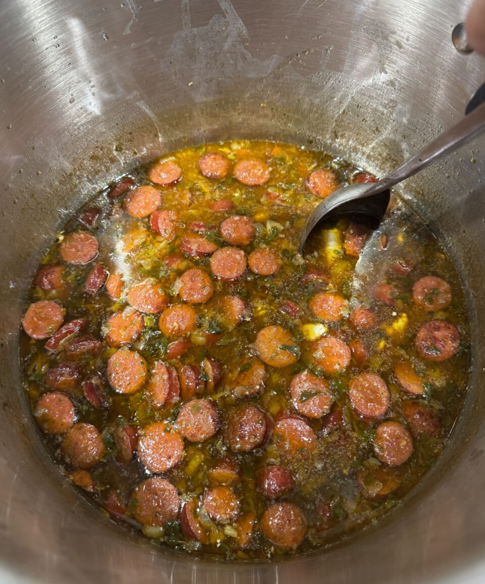 Cut sausage into 1/4-1/2 inch slices and put them into large skillet with a little vegetable oil on medium high heat. The sausage is pre-cooked so it will take a few minutes to sear until it begins to brown and caramelized. At that point, remove from the heat.