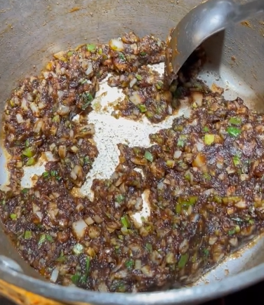 - Decrease the heat and add the chopped onion, green onion, bell pepper, and celery into the roux and stir constantly to cook the vegetables until soft.